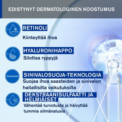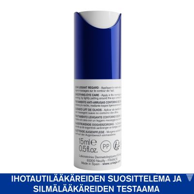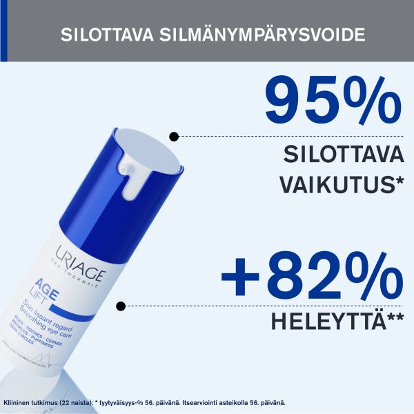 Age Lift Silmänympärysvoide – Tehokasta anti-aging hoitoa Age Lift Silmänympärysvoide vähentää juonteita ja tummia silmänalusia tehokkaasti, kiinteyttäen ihoa huomattavasti. Tuote sisältää retinolia ja hyaluronihappoa, jotka yhdessä torjuvat ikääntymisen merkkejä ja kosteuttavat ihoa runsaasti. Voide suojaa myös ympäristön saasteilta ja digitaalisten laitteiden siniseltä valolta ainutlaatuisen Sinisen Valon Suojausteknologian ansiosta. Retinoli & Hyaluronihappo: Uudistavat ja kosteuttavat ihoa. Dekstraanisulfaatti & Karitevoi: Vähentävät turvotusta ja ravitsevat ihoa. Sopii herkälle Iholle: Hajusteeton ja silmälääkärin testaama. Voide sopii erinomaisesti herkälle iholle. Uriage on ihotautilääkäreiden suosittelema brändi ja tarjoaa tehokkaita tuotteita kaikille ihotyypeille. Koe Age Lift Silmänympärysvoiteen vaikutus – vähemmän juonteita enemmän hehkua! *Tulokset perustuvat kliiniseen tutkimukseen.
