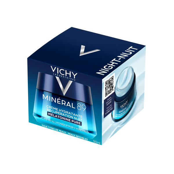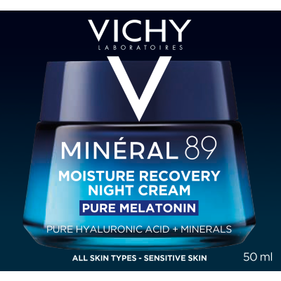 Vichy Minéral 89 Moisture Recovery yövoide 50 ml elvyttää ihom päivän rasituksista ja kosteuttaa tehokkaasti yön ajan. Ainutlaatuinen voide hyödyntää Vichy Laboratoriesin kehittämää yhdistelmää, jossa melatoniini ja muut tehokkaat ainesosat kuten hyaluronihappo, mineraalit, B3- ja E-vitamiini tukevat ihon yön aikaista uusiutumista.