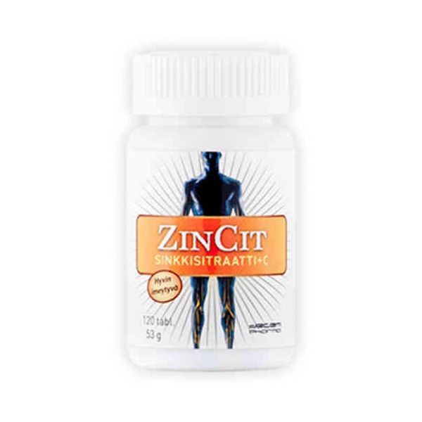 ZinCit on hyvin imeytyvä sinkkisitraattivalmiste (25 mg sinkkiä). ZinCitissa on mukana myös C-vitamiinia (100 mg), flavonoideja (42 mg) sekä ruusunmarjauutetta (30 mg). Sinkki vaikuttaa mm. vastustuskykyyn, hedelmällisyyteen sekä ihon, luuston, hiusten ja kynsien kuntoon.
